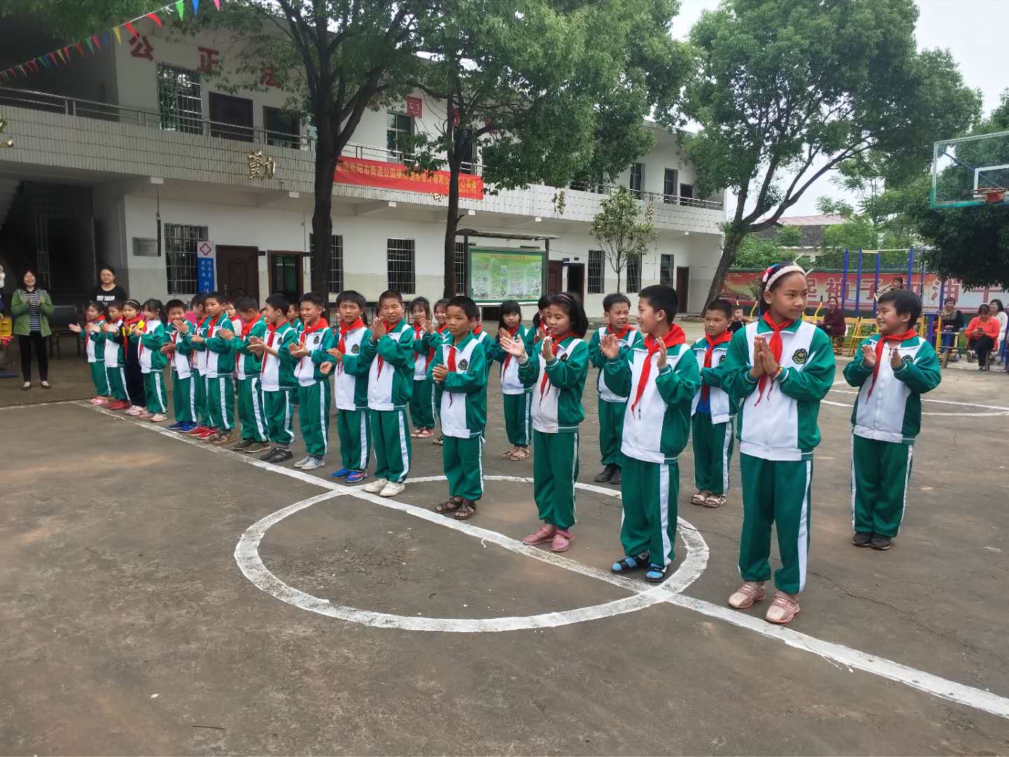 圖2:漸佳小學(xué)全體學(xué)生列隊(duì)歡迎志愿者的到來(lái)