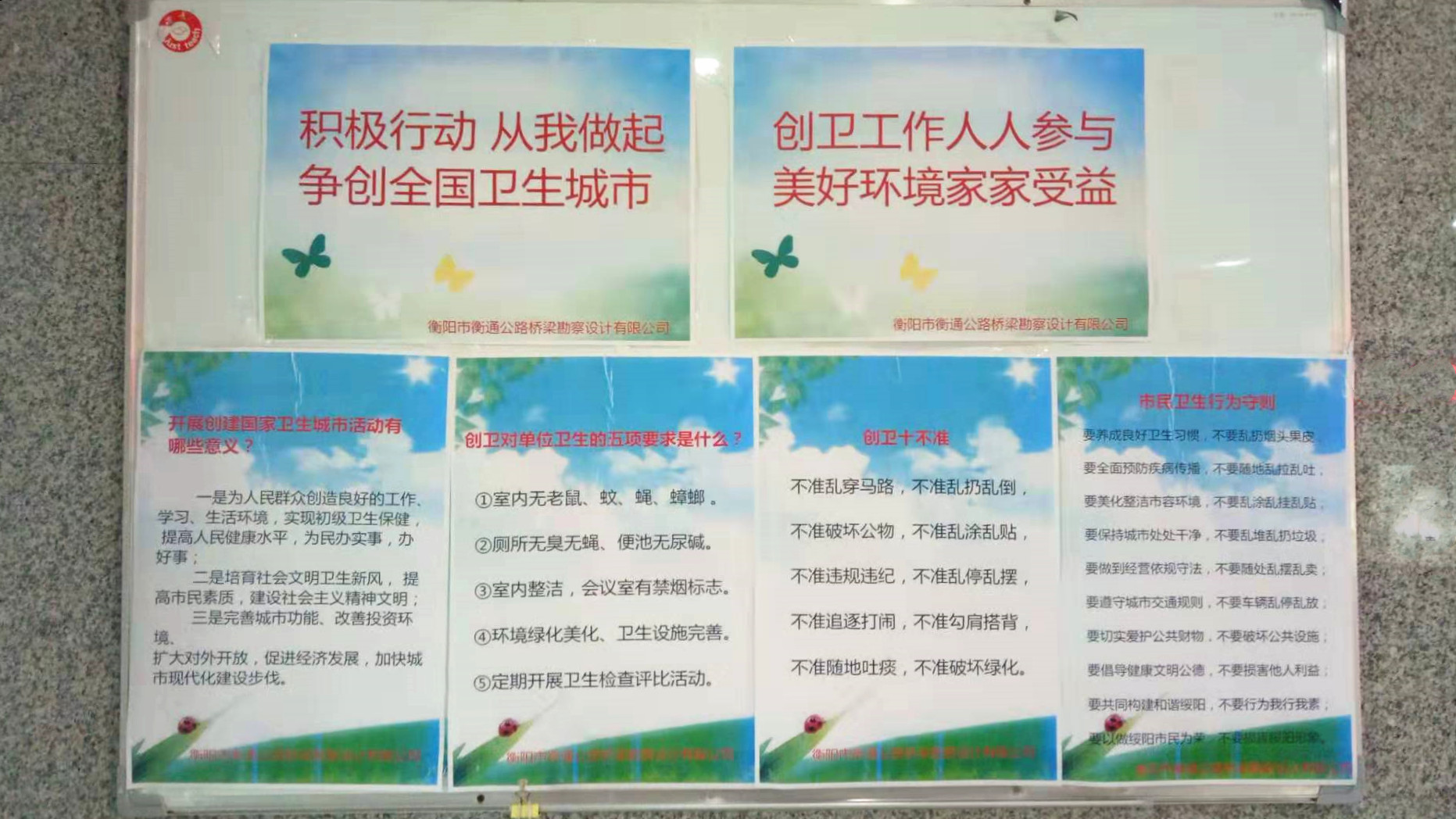 衡陽市衡通公路橋梁勘察設(shè)計有限公司就一直保持著這樣的姿態(tài)。積極宣傳創(chuàng)衛(wèi),公司通過創(chuàng)衛(wèi)宣傳欄,滾動創(chuàng)衛(wèi)標語,組織同事與家屬、鄰居互相傳遞創(chuàng)衛(wèi)信息,讓創(chuàng)衛(wèi)成為“熱詞”;全力支持創(chuàng)衛(wèi),公司積極響應(yīng)市委、市政府號召,落實行動,規(guī)范行為,讓創(chuàng)衛(wèi)成為“自覺”;主動參與創(chuàng)衛(wèi),公司每周五開展“衛(wèi)生大掃除”活動,徹底清理單位辦公區(qū)域和院落衛(wèi)生死角,讓創(chuàng)衛(wèi)成為“日!薄
