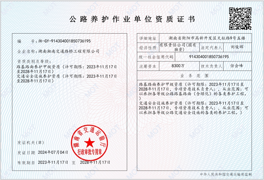公路養(yǎng)護作業(yè)單位資質(zhì)證書
